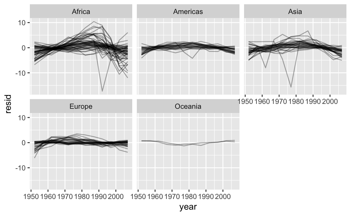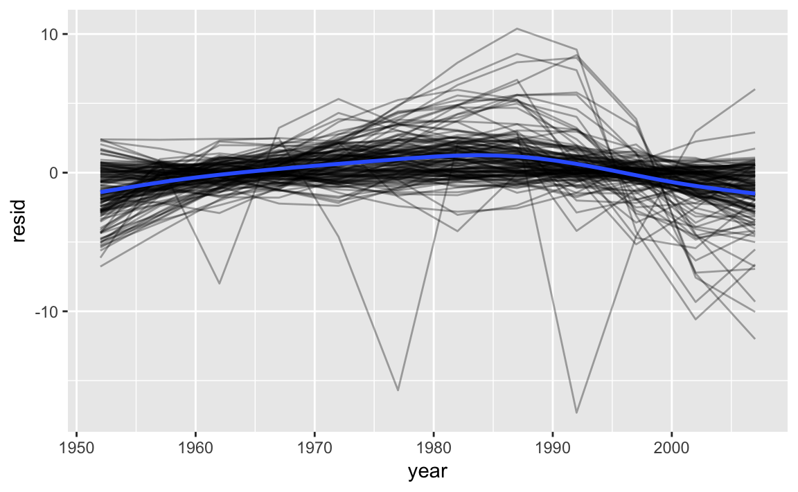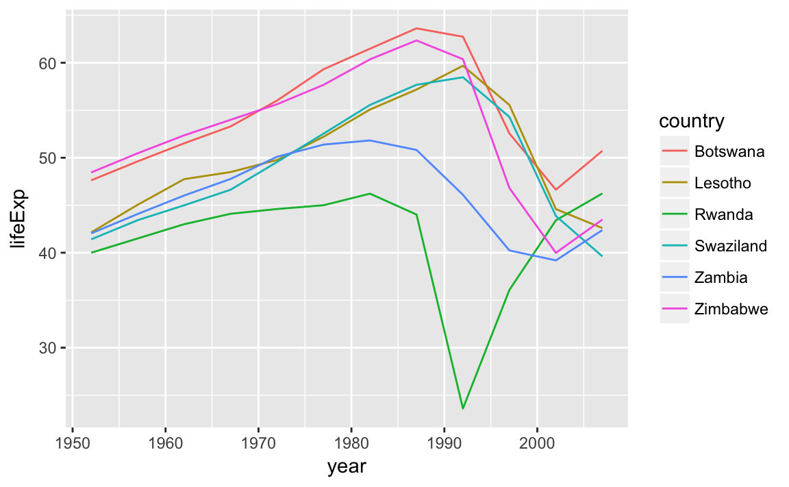 This is a small dataset: it only has ~1,700 observations and 3 variables. But it’s still hard to see what’s going on! Overall, it looks like life expectancy has been steadily improving. However, if you look closely, you might notice some countries that don’t follow this pattern. How can we make those countries easier to see?