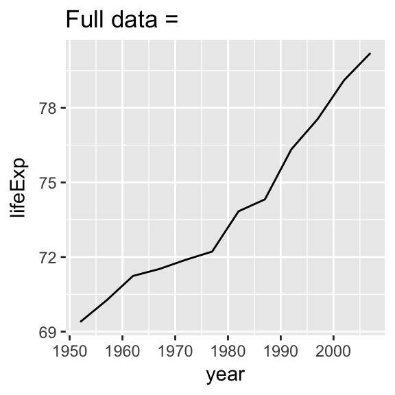 This creates an data frame that has one row per group (per country), and a rather unusual column: data. data is a list of data frames (or tibbles, to be precise). This seems like a crazy idea: we have a data frame with a column that is a list of other data frames! I’ll explain shortly why I think this is a good idea.