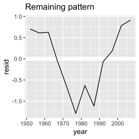 One way is to use the same approach as in the last chapter: there’s a strong signal (overall linear growth) that makes it hard to see subtler trends. We’ll tease these factors apart by fitting a model with a linear trend. The model captures steady growth over time, and the residuals will show what’s left.