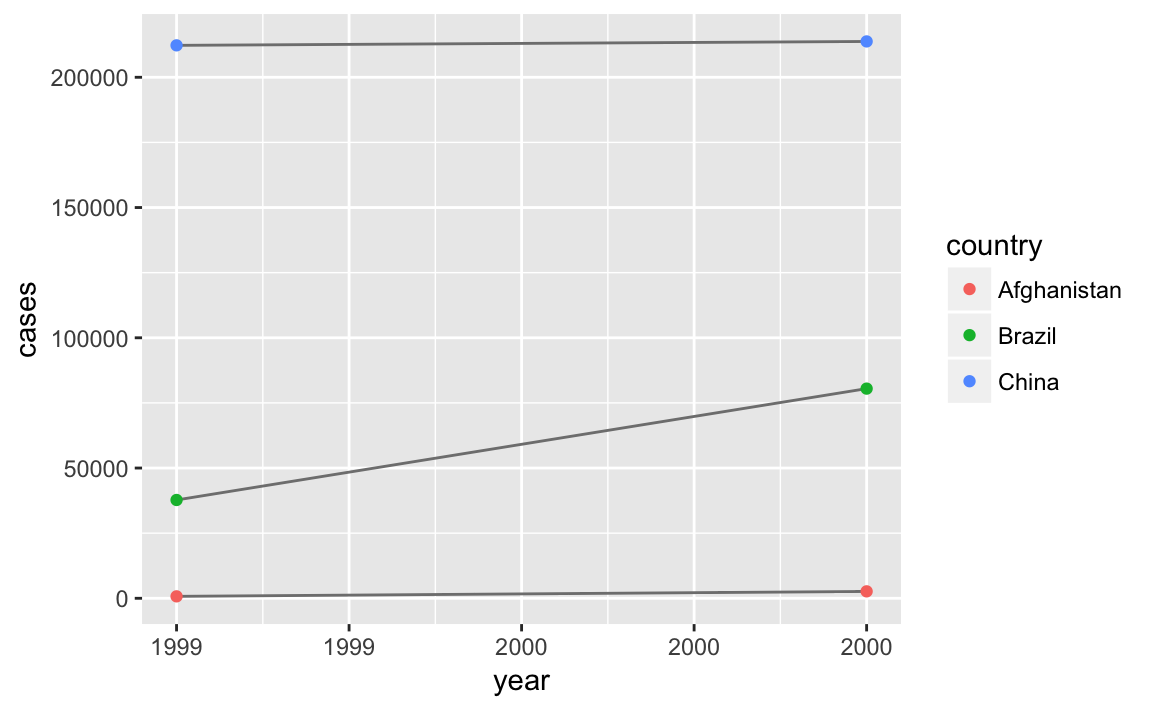 #> 3 China 1272915272 1280428583These are all representations of the same underlying data, but they are not equally easy to use. One dataset, the tidy dataset, will be much easier to work with inside the tidyverse.