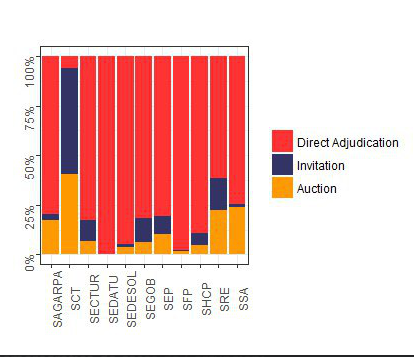 Legal dispositions on public purchases give preference to adjudication through public licitations, which allow for the development of an effective competition environment. However, despite the budgetary constraints imposed over direct adjudications, they are very common in some dependencies which evade the budgetary constraints adjudicating atomized contracts. Even when the adjudication is made through public licitations, there are some known cases of collusion among providers which lead to higher prices for the good or service being provided to the government. As collusion is not easily detected, procurement regulation has become increasingly complex. Even with the increased complexity, the government has not been able to identify collusion among providers and the procurements have been hindered by bureaucratic processes that increase proposal and delivery times and do not benefit the quality of the good or service being provided. The Auditoria Superior de la Federacion has declared that even if regulation is fulfilled, contracts don’t pose a net benefit for the State [asf2014]. Several academics [boyer2015] [connor2008] calculate that lack of competition and collusion among government providers can result in a 17 to 36% overcharge.