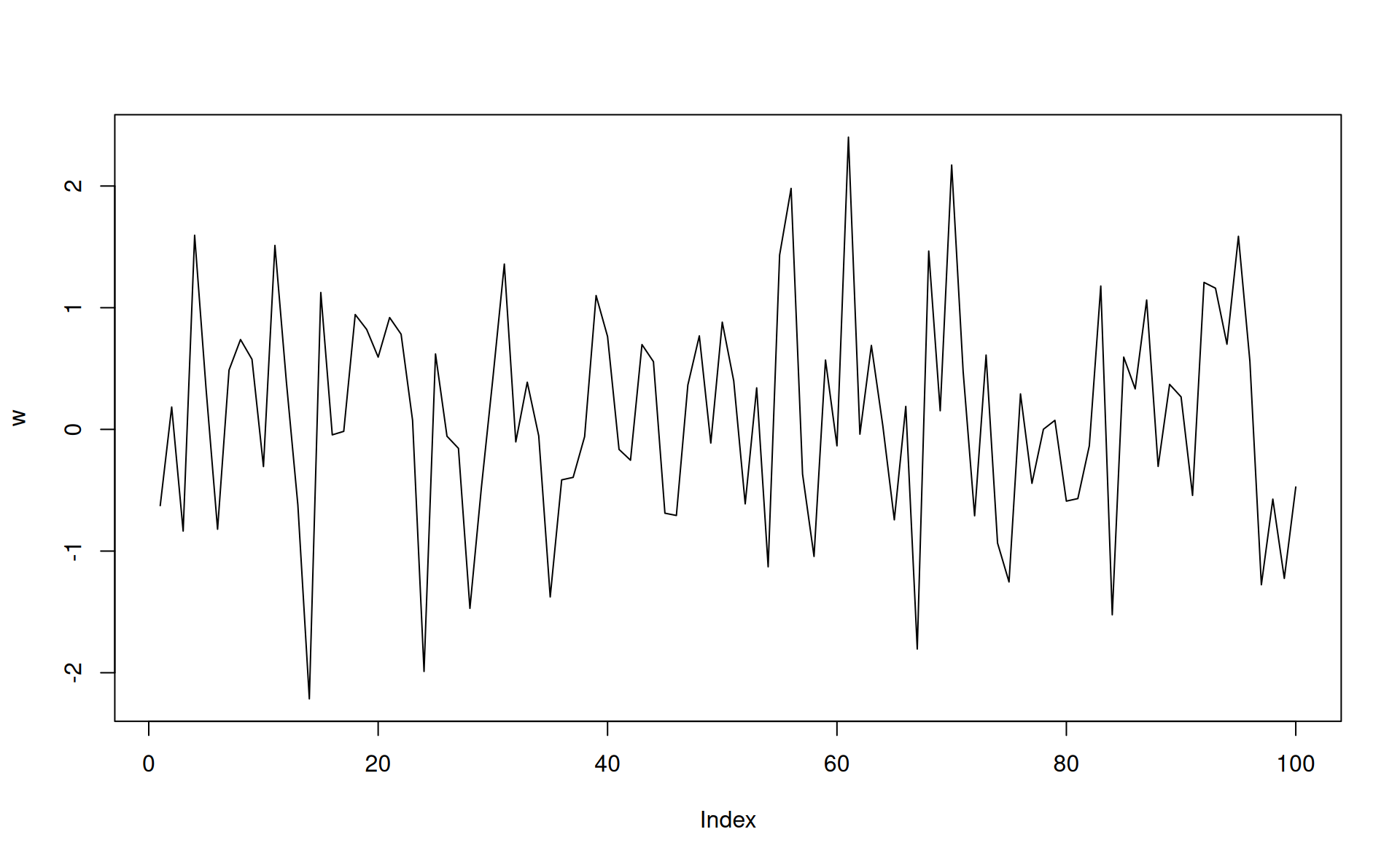A time series \({w_t : t=1,2, \ldots , n}\) is discrete white noise (DWN) if the variables \(w_1, w_2, \ldots, w_n\) are independent and identically distributed with a mean of zero