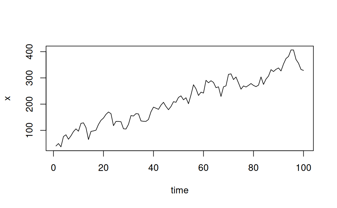 The model for the code above can be expressed as \(x_t=50+3t+z_t\) where \({z_t}\) is the \(AR(1)\) process \(z_t=0.8z_{t-1}+w_t\) and \(w_t\) is Gaussian white noise with \(\sigma=20\)
