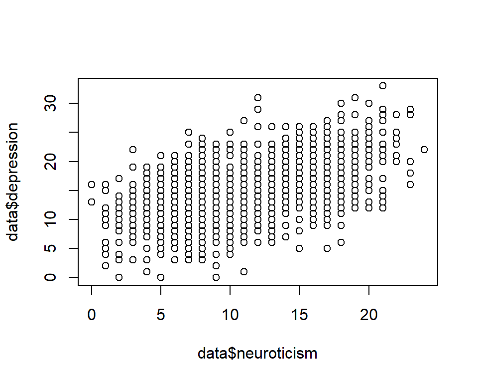 cor(data$neuroticism, data$depression, use="complete.obs")## [1] 0.5346548
