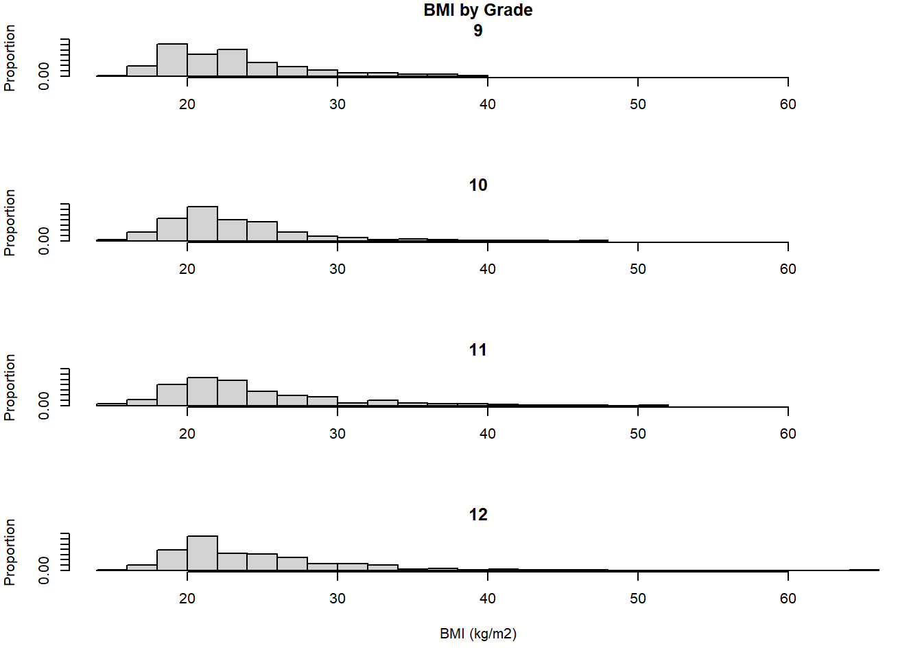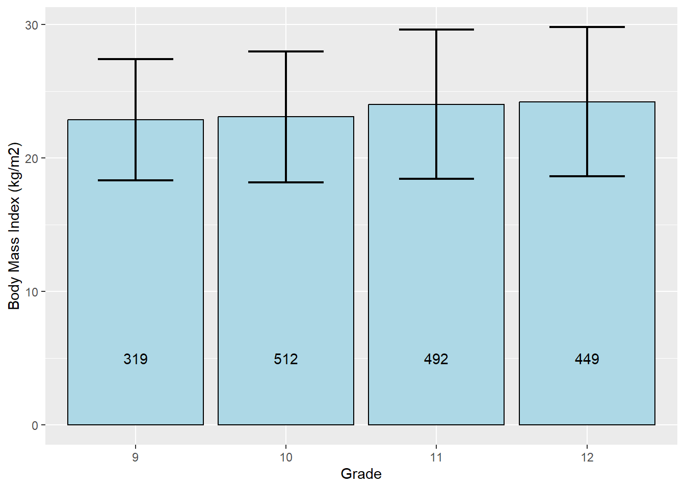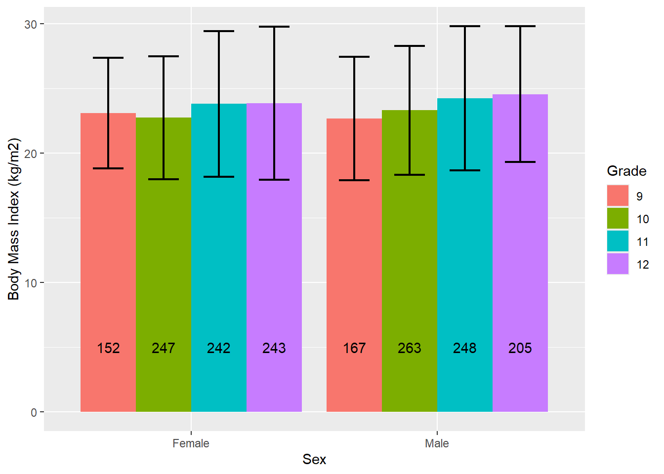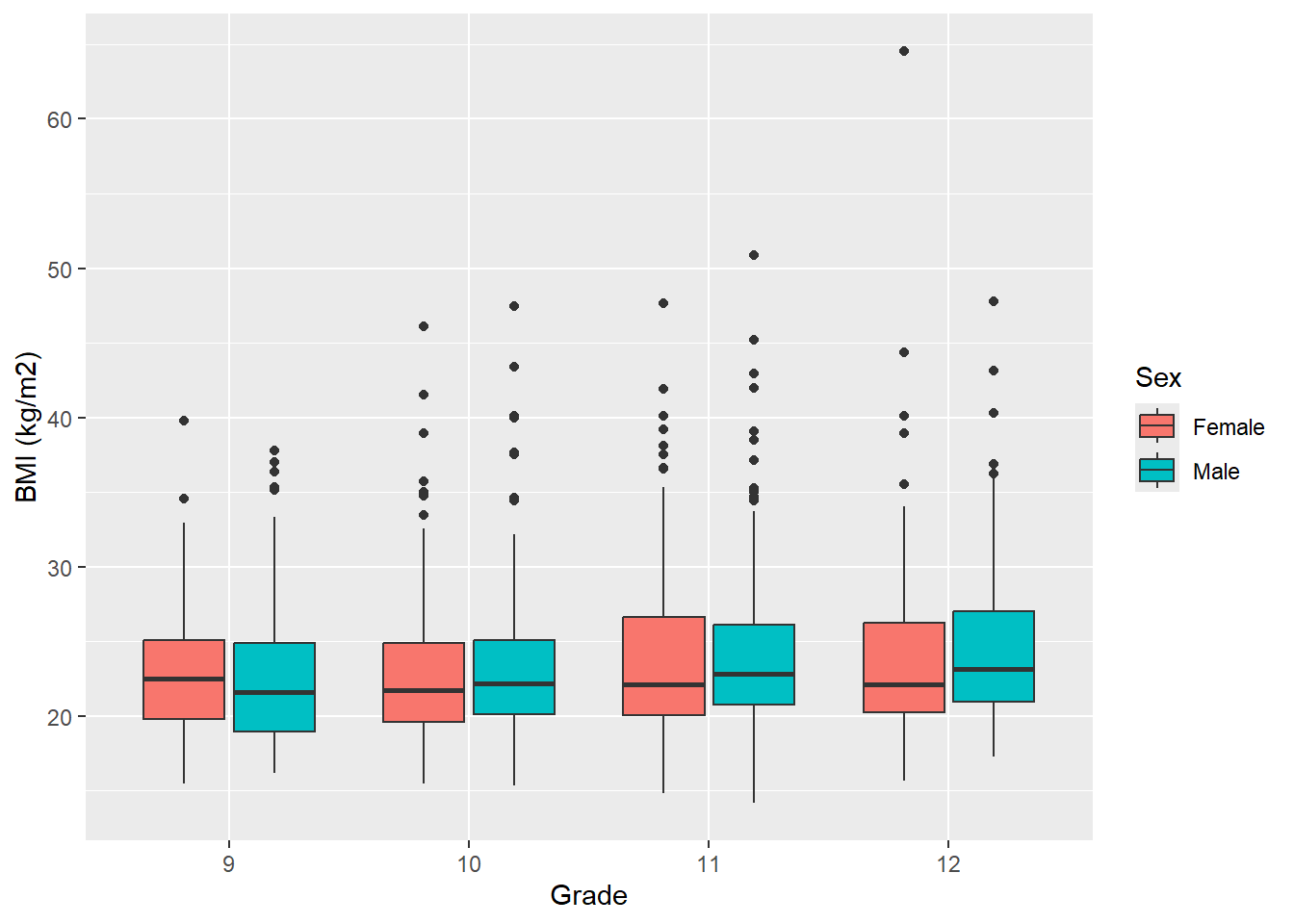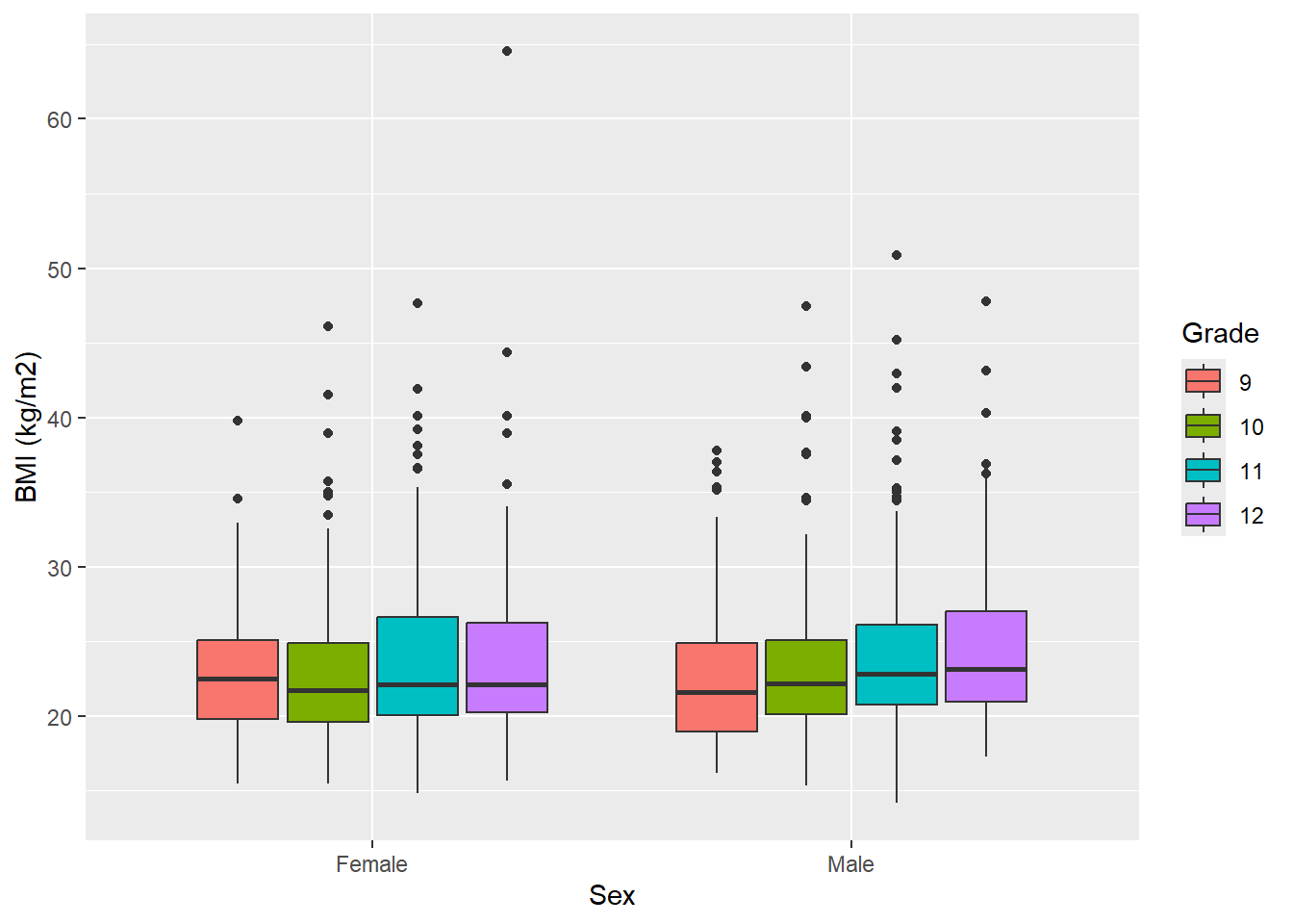 labs(y = "Body Mass Index (kg/m2)", x = "Grade", fill = "Sex")