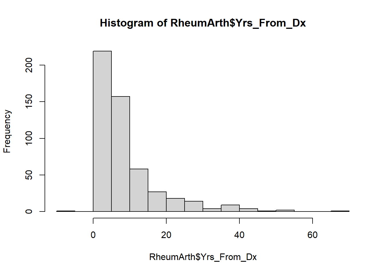 NOTE: Instead of using the condition !(RheumArth$AgeGp %in% c(1, 2)), I could have used the condition RheumArth$AgeGp == 3. But I know from the codebook that the only valid values are 1 and 2, so the code I used can set all invalid value to missing, not just 3. Also, I wanted to illustrate the use of “not” ! with %in%. There is no “not in” operator, so I put the ! operator in front of the opposite condition in parentheses.