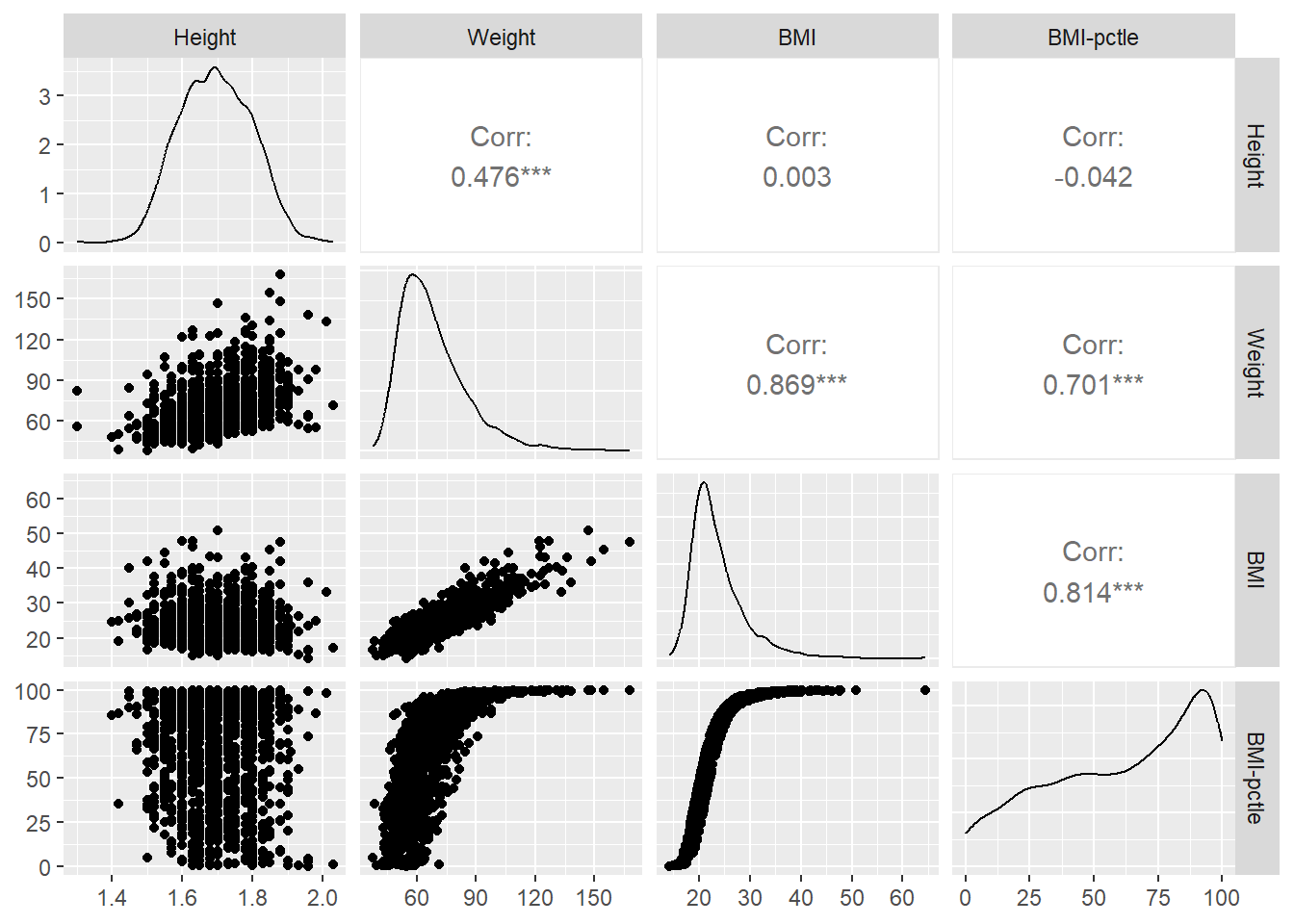 ggpairs(columnLabels = c("Height", "Weight", "BMI", "BMI-pctle"))