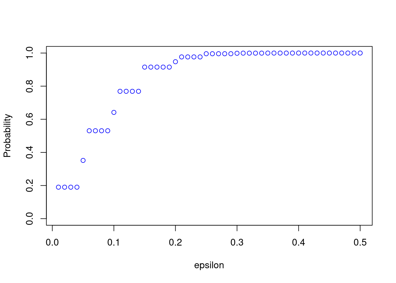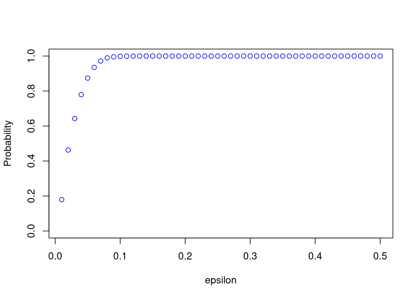plot(all_eps,probs,ylim = c(0,1),xlab="epsilon",ylab="Probability", col = 'blue')