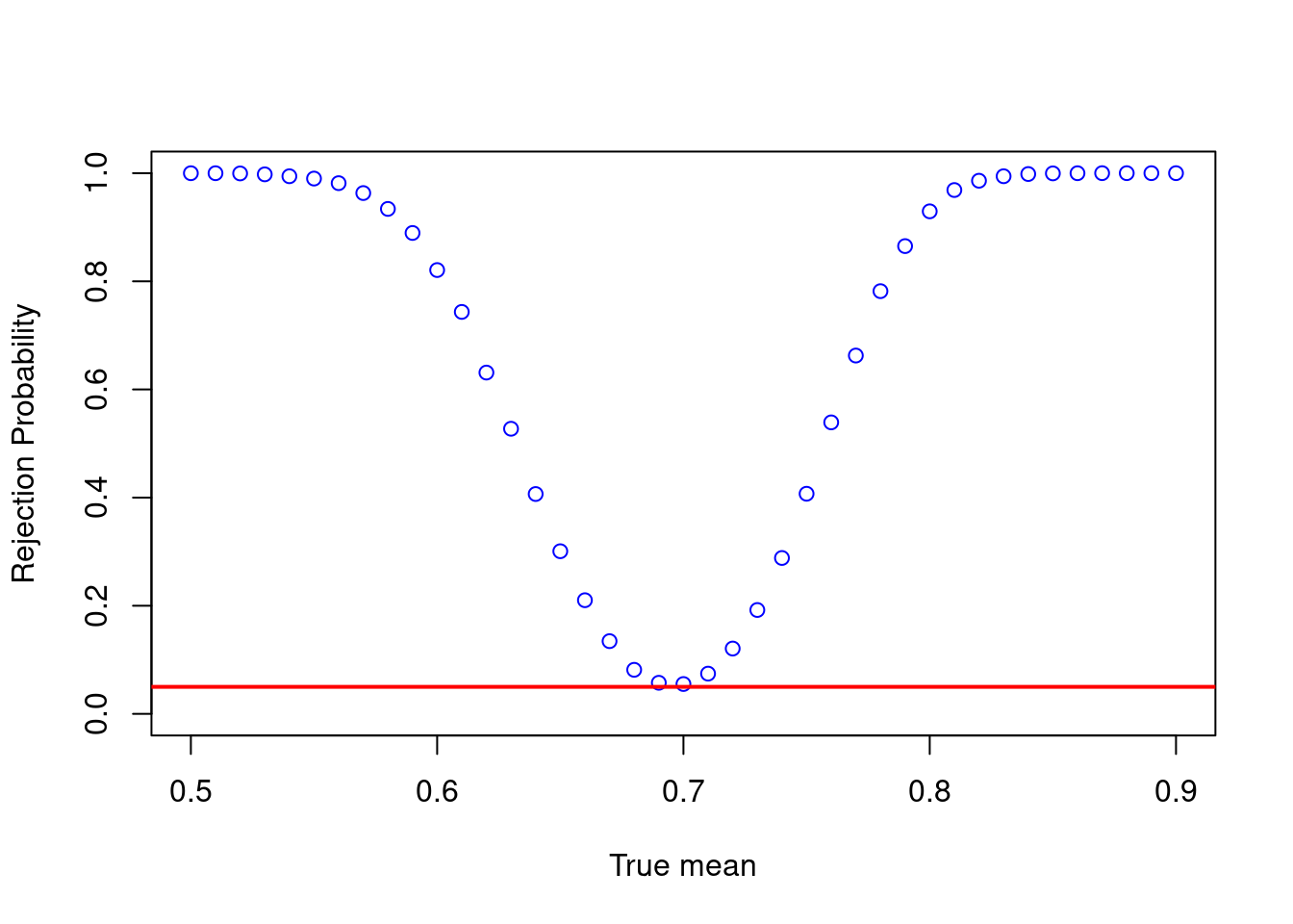 i.e. we reject a false null hypothesis with probability approaching 1. However, for a small sample size, the rejection probability is typically much smaller when \(\mu_0\) is close to \(\mu\).
