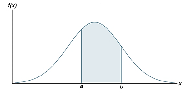 With continuous random variables, the counterpart of the probability function is the probability density function (PDF), also denoted by \(f(x)\). The difference is that the probability density function does not directly provide probabilities. However, the area under the graph of \(f(x)\) corresponding to a given interval does provide the probability that the continuous random variable x assumes a value in that interval.