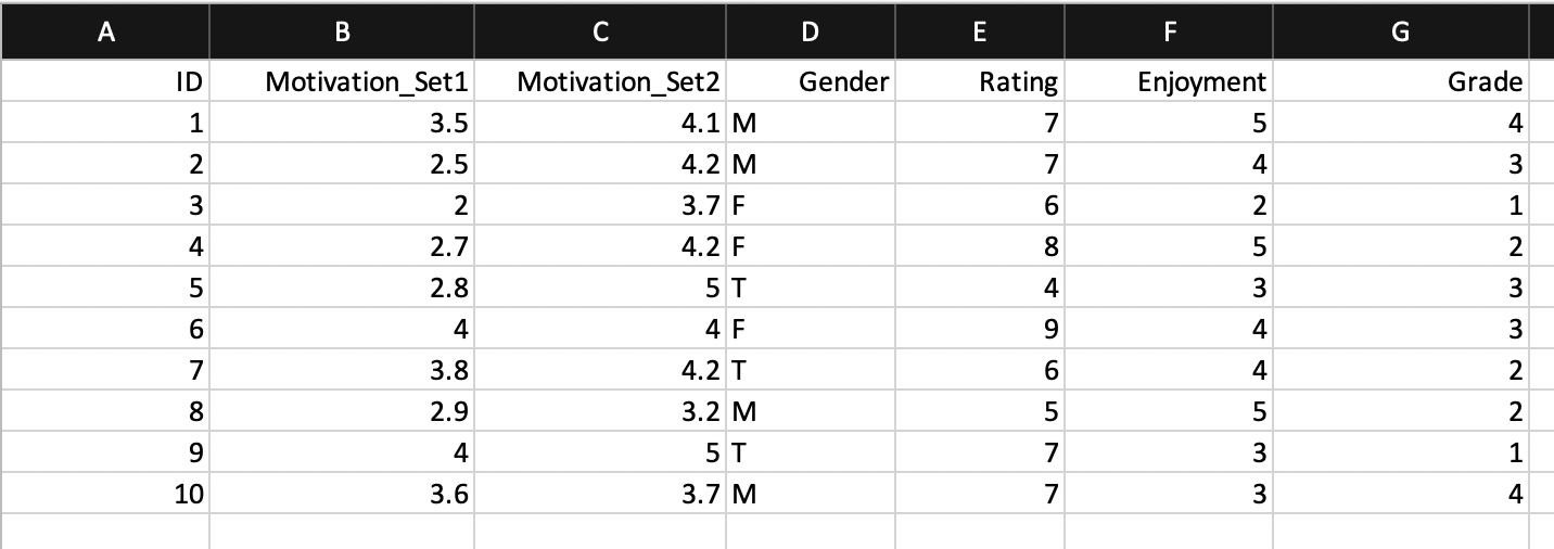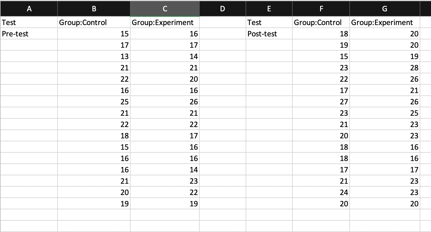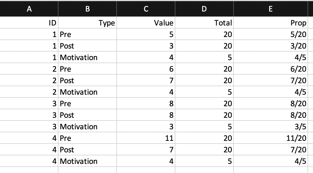1,20,15and8); and - Each value must have its own cell (e.g., a vocabulary score of 15, not 15/30).