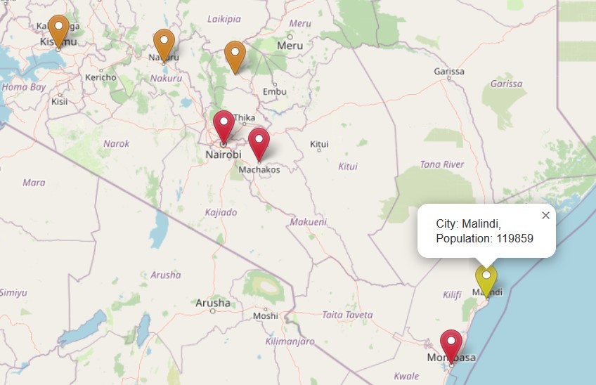 In the next code sample, we shall create city marker icons whose colors shall be determined by the size of the city’s population. We will work with three colors: yellow, orange and red. Yellow shall mark the smallest city while red shall indicate the largest. The below code shows how this categorization is worked out.