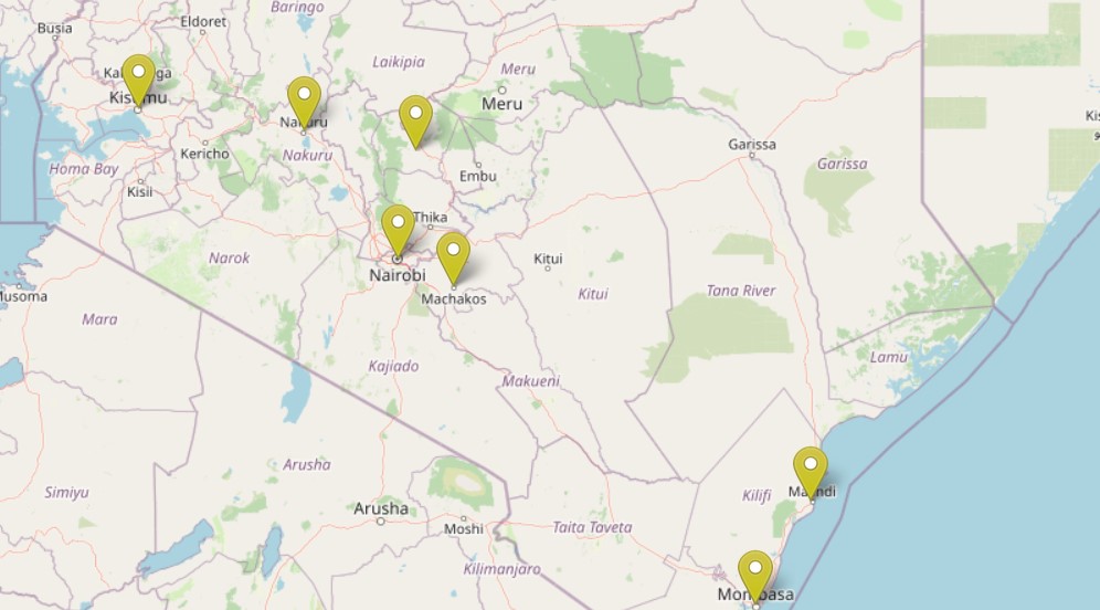 var map = L.map('myMap').setView([-1.295287148, 36.81984753], 7);