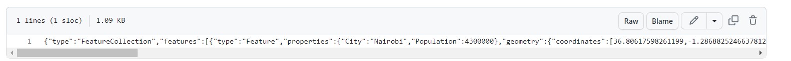 Just a small note before going on. When the GeoJSON file has the population values enclosed in strings "", they are automatically rendered on a map on the Github server as shown below.