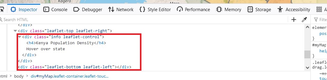 The above code returns the DOM element for the control and creates a <div> of class info. This is done through the help of L.DomUtil which, according to the Leaflet website, provides utility functions to work with the Document Object Model (DOM)2. Actually, this new <div> of class info is created when you fire up your browser but will only exist in your browser. Don’t expect it to magically appear in your static map.html file.