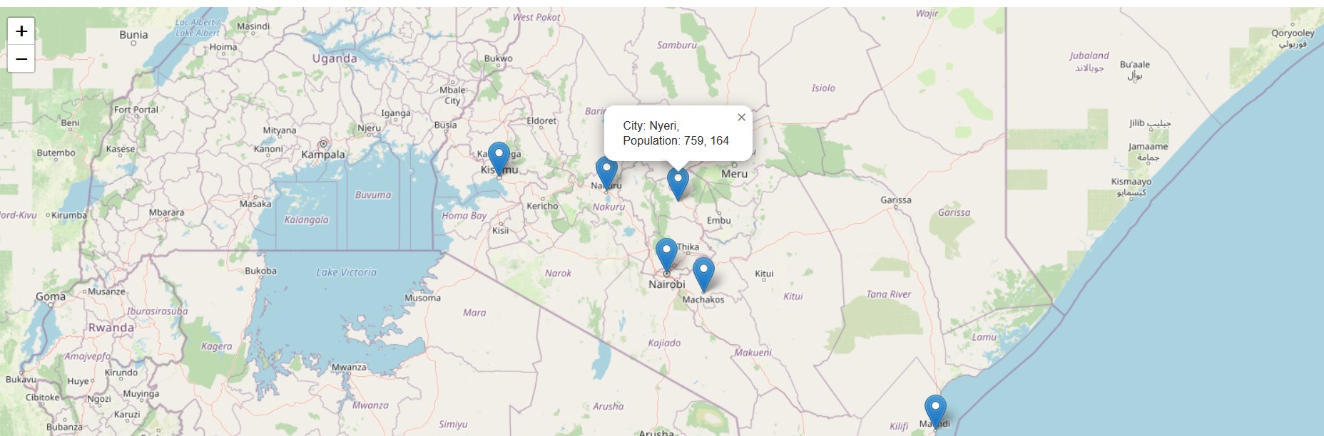 In the return statement above, we added the HTML tag <br> to separate the City and Population keys from our GeoJSON. Doing so will return neat marker texts where the city name and population figures are in two separate lines.