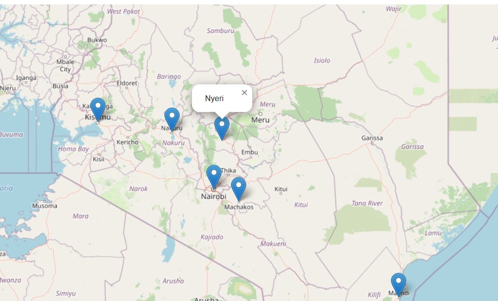 Refresh your map.html. It’s a map of Kenya alright, but none of our .geojson features appear yet. We are about to change that. Leaflet offers the L.geoJSON class to add GeoJSON data to a map. The class name speaks for itself and therefore let’s use it to add our GeoJSON features. Add the following code below the other Leaflet map class layers.