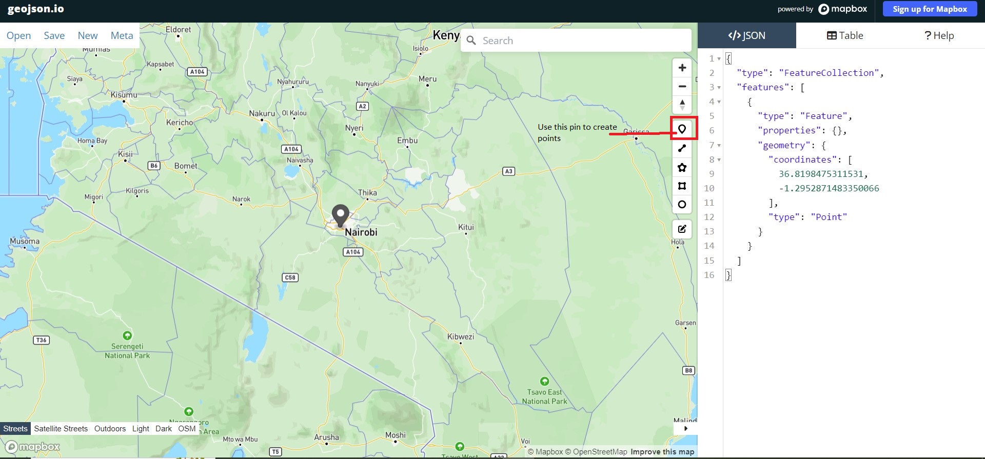 On your right, under the </>JSON tab, the Mapbox folks have already given you a head start by indicating what feature type and features will go into your geojson file. These are important as any website uses these keywords when parsing information from the GeoJSON file. Zoom to Kenya and click a point on top of the Nairobi dot pin, like shown below. Use the highlighted pin in the image below to create a marker over Nairobi.