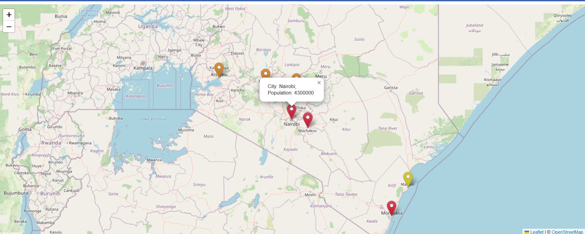 In the above map, large cities with populations above 800, 000 have been categorized with a red marker, those with populations below 250, 000 with a yellow marker and those in between with an orange marker. In all cases, our bindPopup() still contains the same settings of showing both the city name and population size.