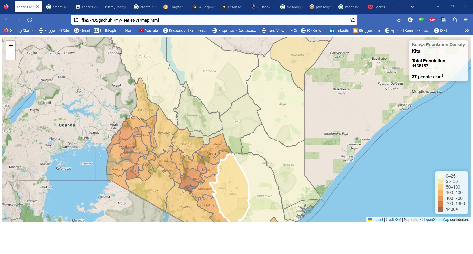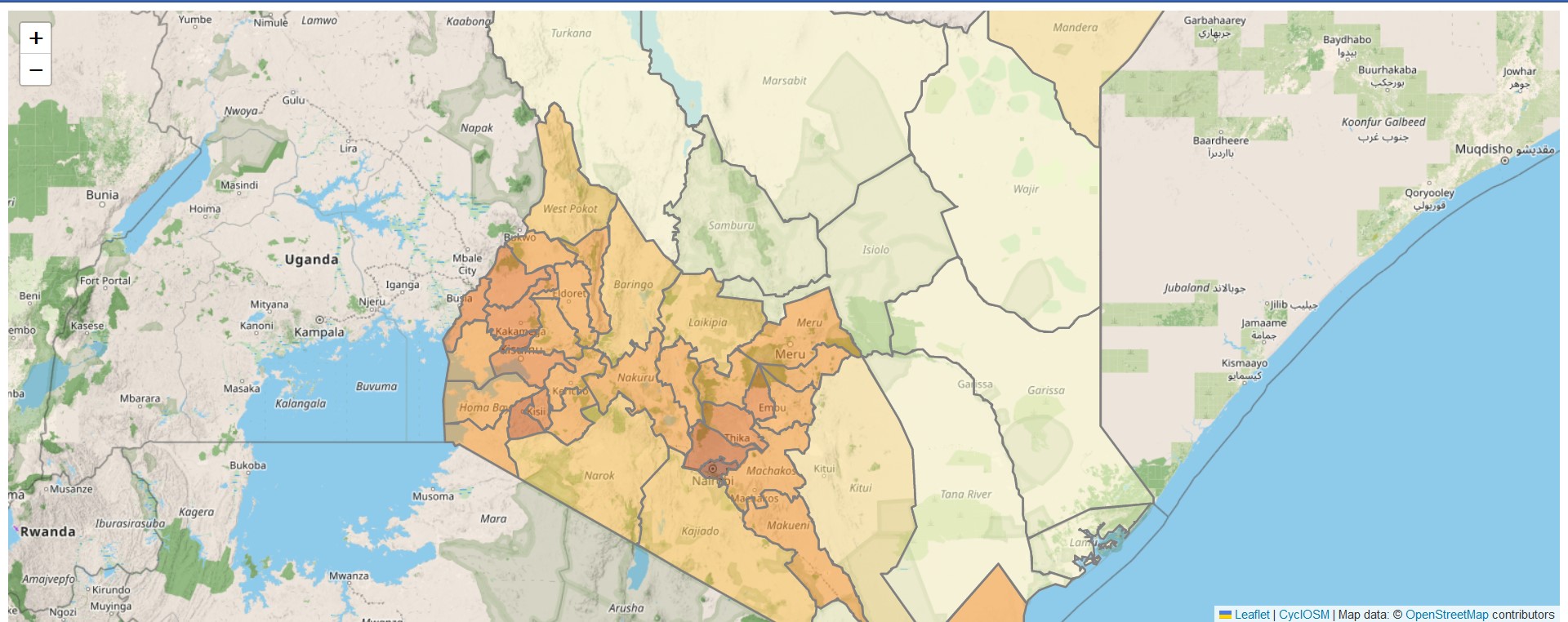 We will now move from markers to something larger than life –choropleth maps. What the heck are choropleth maps? You may ask. Geographers will roll their eyes over this term because they have come across it innumerable times throughout their career. However, for the sake of new readers, a choropleth map is a map whose geographical areas or regions are colored, shaded or patterned in relation to a data variable. If during election time you have seen a map that has draped the winning candidate in (a) particular state(s) with their party theme colors, then that’s a choropleth map. Most population maps are also choropleth maps. In this chapter, we will create a choropleth map of Kenyan counties, and make it interactive by leveraging the area and population characteristics of each county.