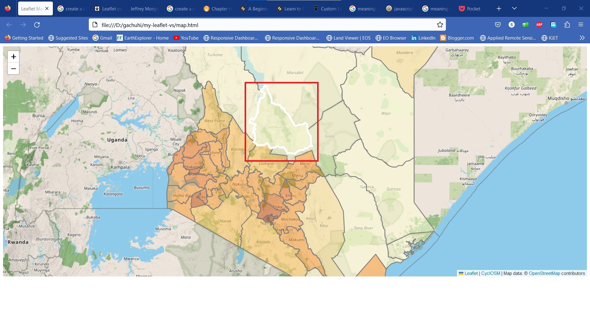 Finally, we mentioned we want to zoom to a particular county upon clicking it. The following code fits our map to the bounds of the particular county that was clicked. Note that fitBounds is parsed getBounds which gets the boundaries of the county clicked upon. The browser is able to identify the county clicked upon through the help of the e parameter and e.target.