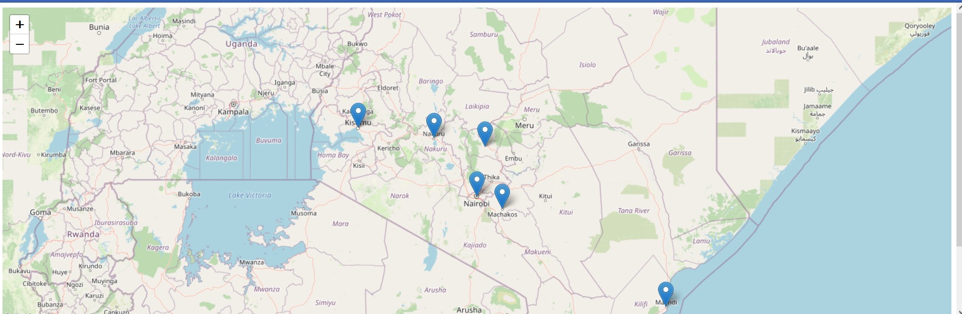 Refresh your map.html. It’s a map of Kenya alright, but none of our .geojson features appear yet. We are about to change that. Leaflet offers the L.geoJSON class to add GeoJSON data to a map. The class name speaks for itself and therefore let’s use it to add our GeoJSON features. Add the following code below the other Leaflet map class layers.