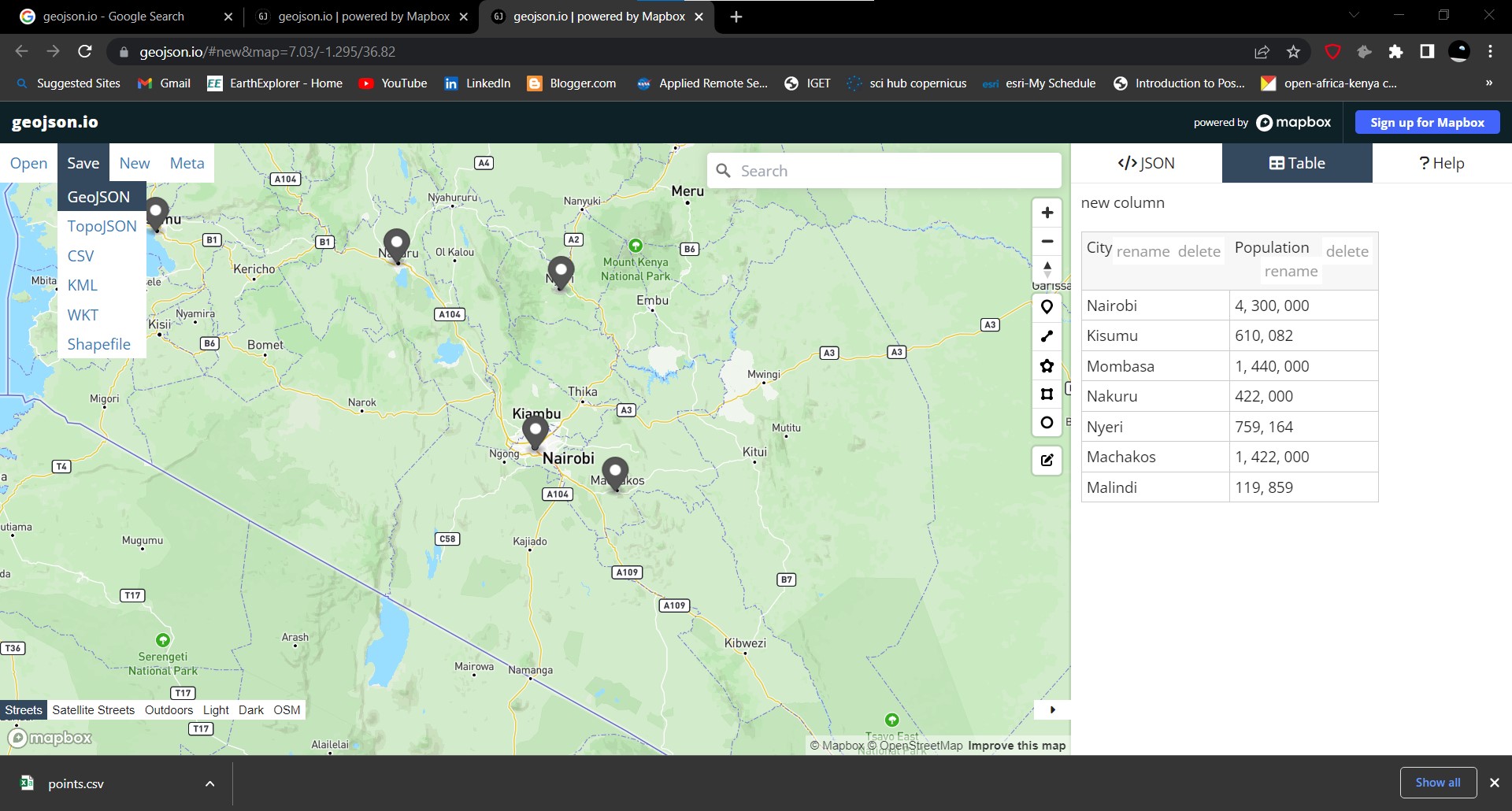 It may look intimidating to create a GeoJSON file without hardly making any errors, and it actually is, but luckily the geojson.io website does the heavy lifting for us. We shall head over to it and create a geojson file of some cities and their population.