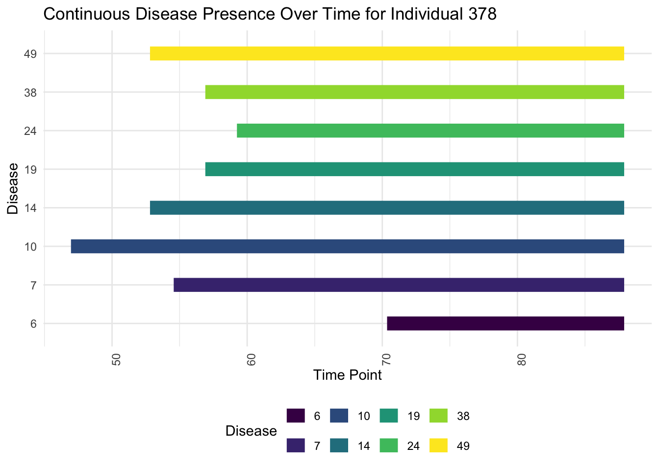 labs(title = paste("Continuous Disease Presence Over Time for Individual", individual_sample), x = "Time Point", y = "Disease") +