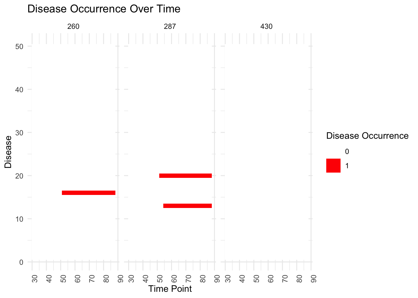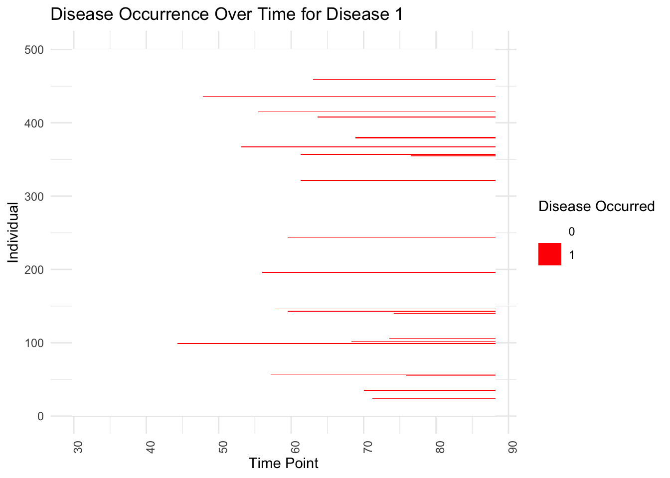 labs(title = "Disease Occurrence Over Time for Disease 1", x = "Time Point", y = "Individual") +