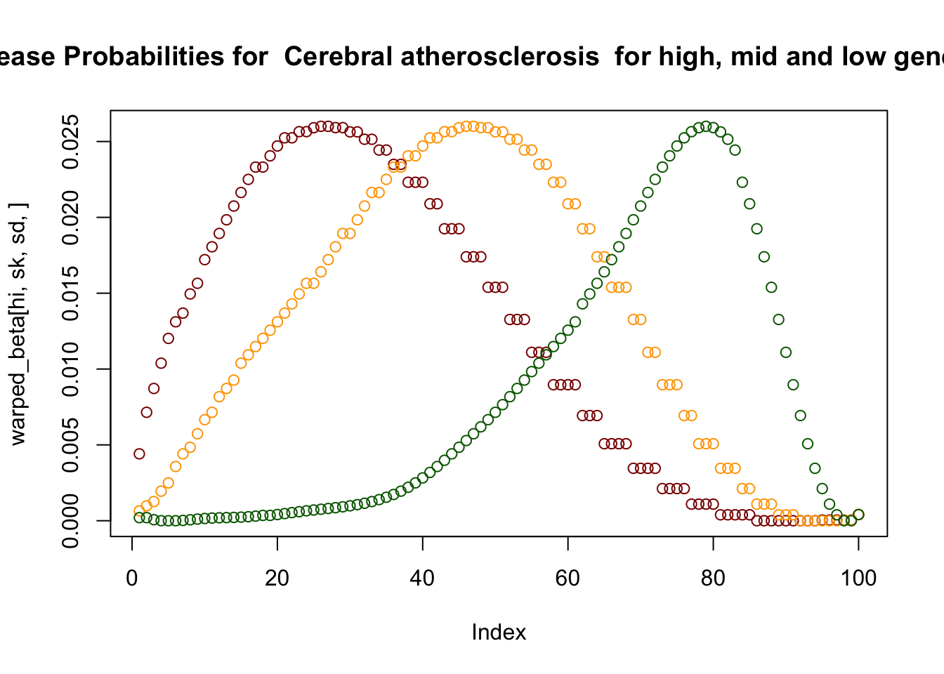 plot(warped_beta[hi,sk,sd,],col="darkred",main=paste("Disease Probabilities for ",sampled_pheno[4]," for high, mid and low genetic risk"))