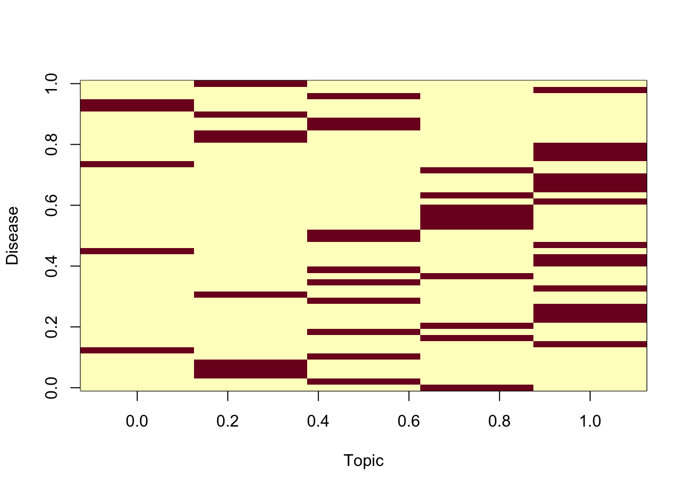 image(t(disease_topic_matrix),xlab="Topic",ylab="Disease")
