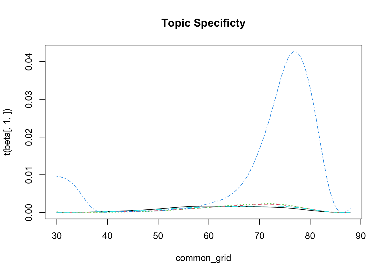matplot(common_grid,t(beta[,1,]),type ="l",main="Topic Specificty")