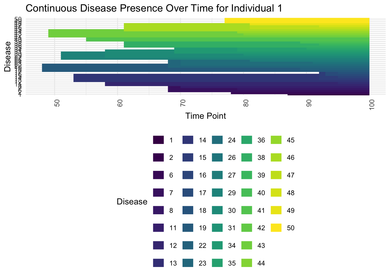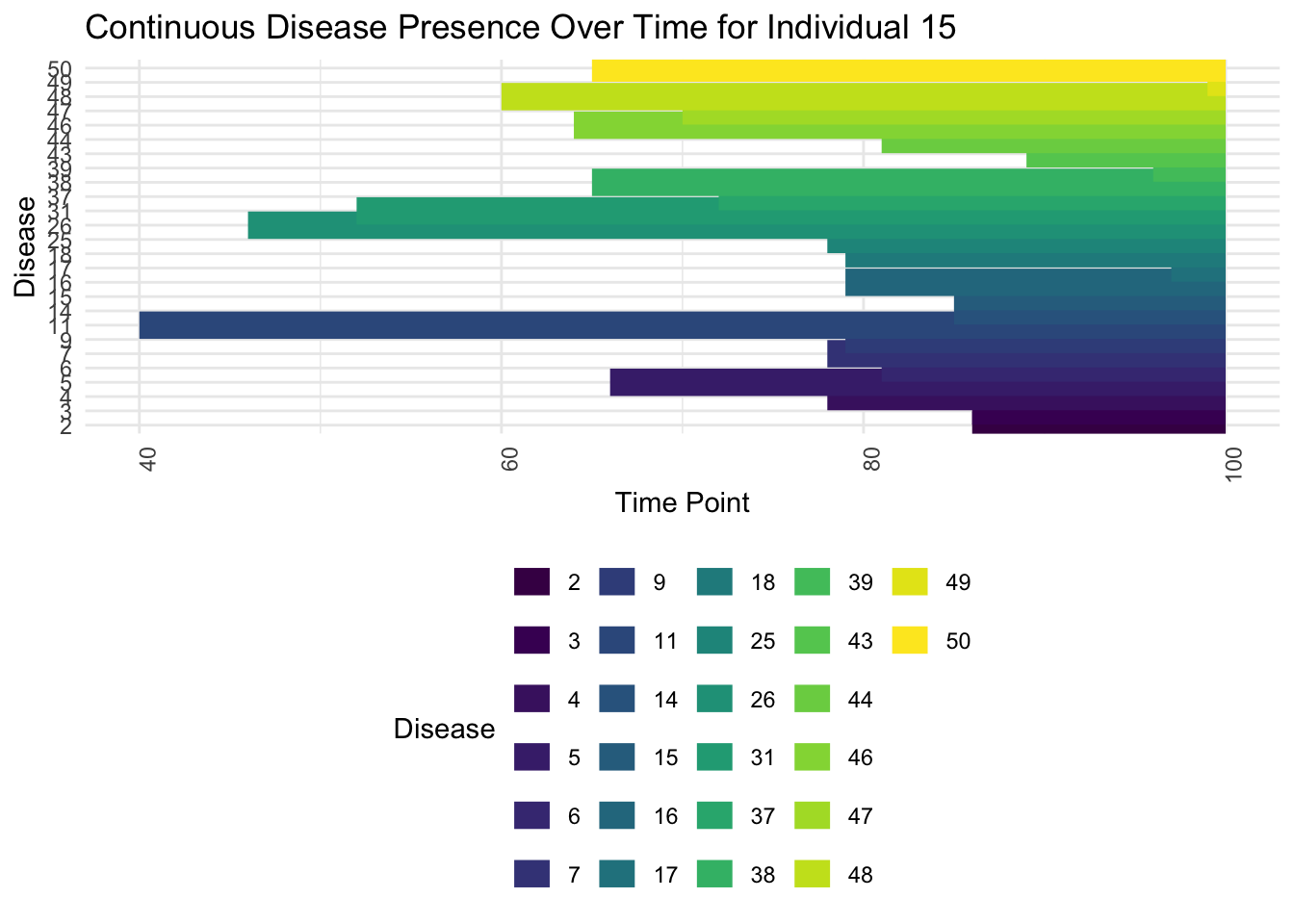 labs(title = paste("Continuous Disease Presence Over Time for Individual", individual_sample), x = "Time Point", y = "Disease") +