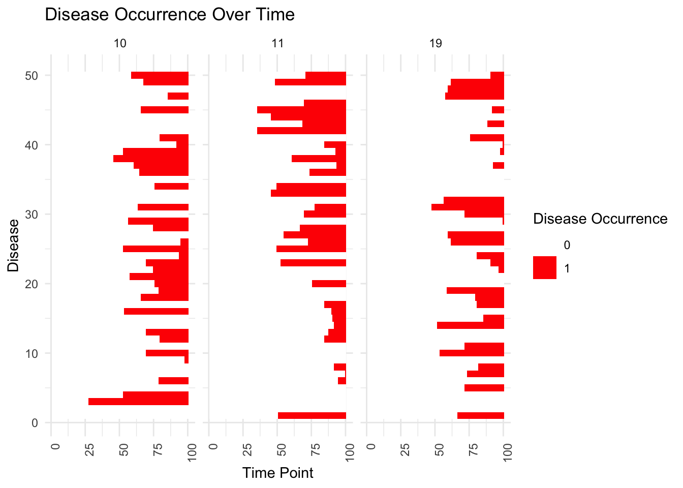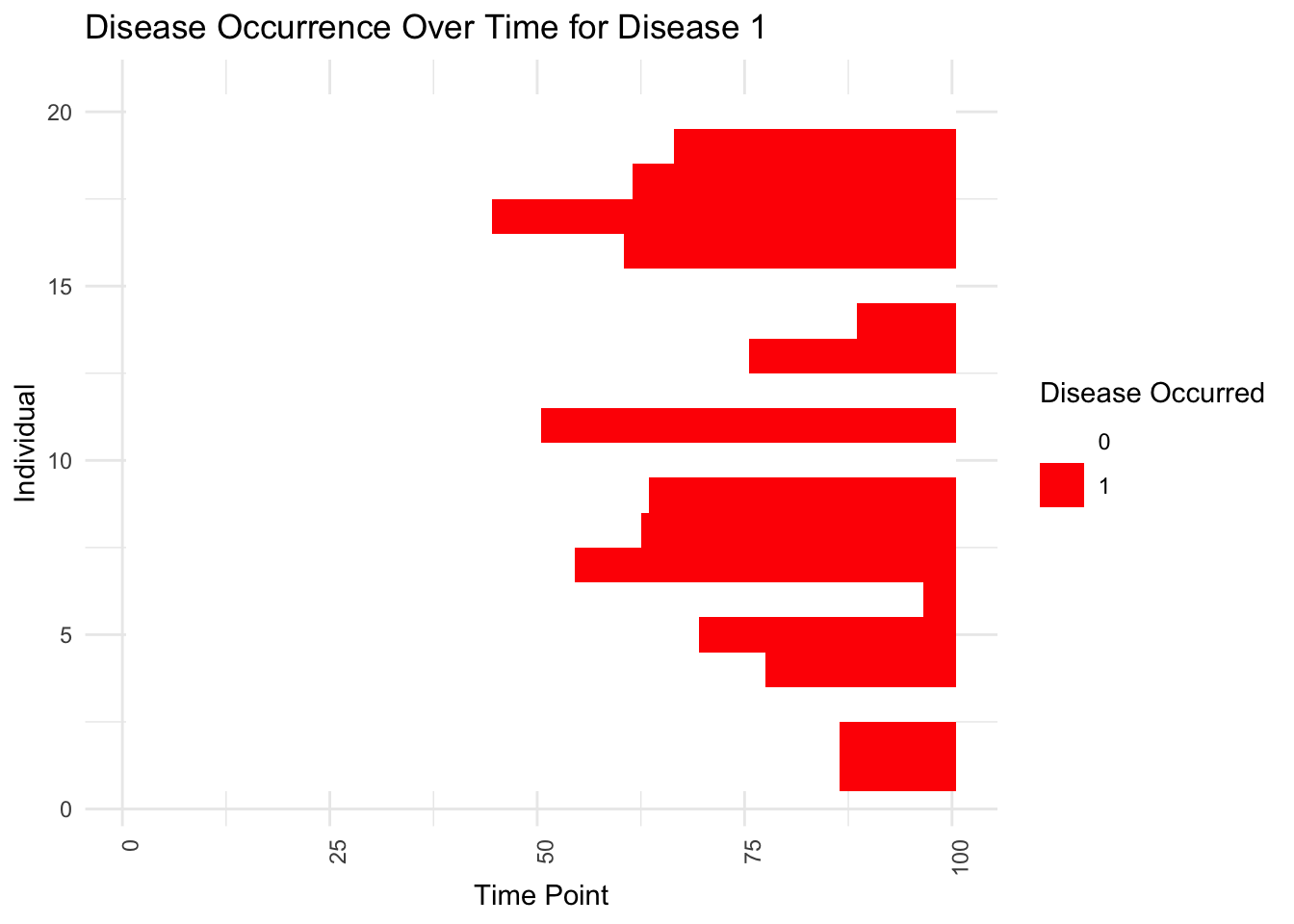 labs(title = "Disease Occurrence Over Time for Disease 1", x = "Time Point", y = "Individual") +