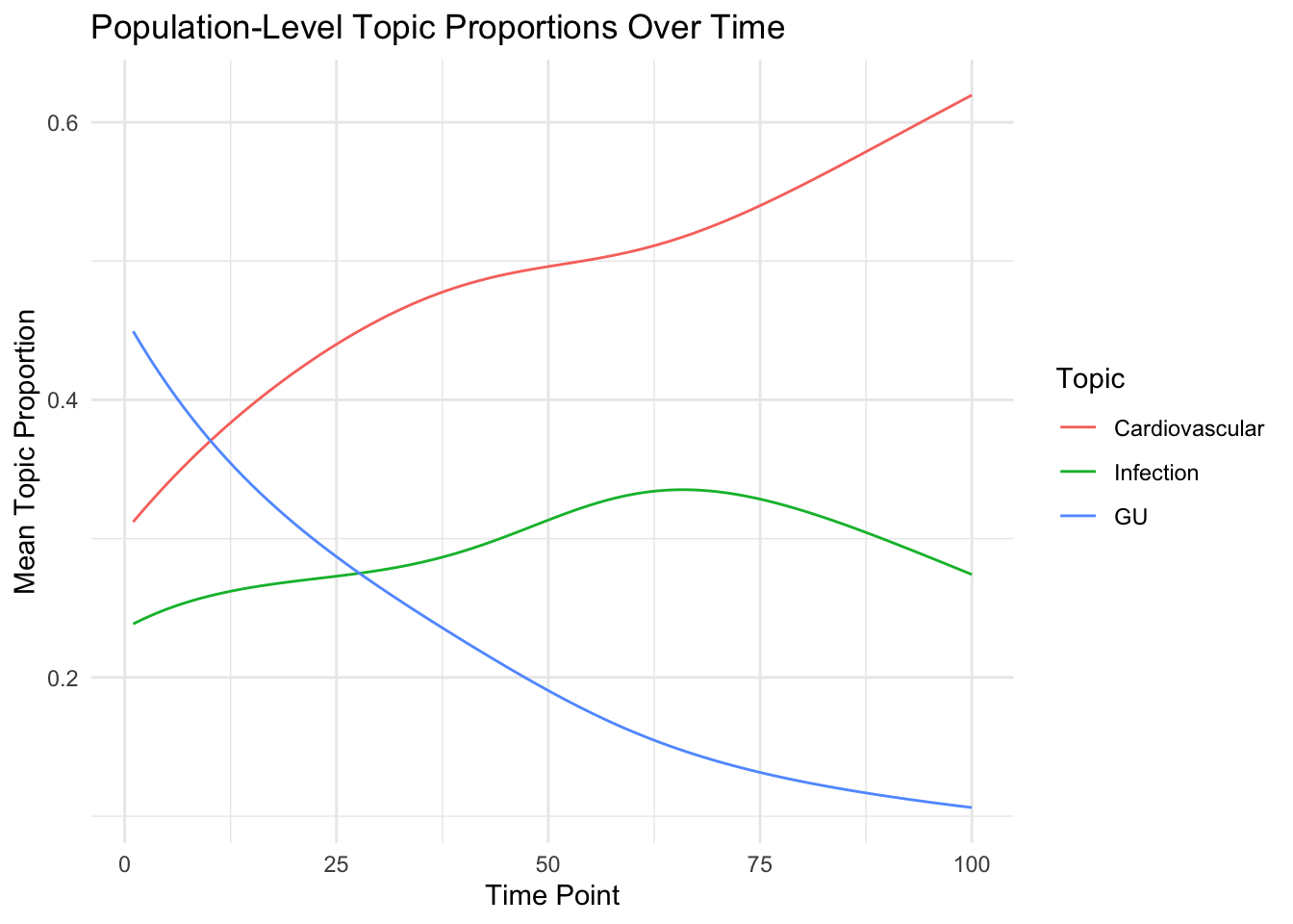 - \(\beta_{k,v,t}\): The probability of disease \(v\) in topic \(k\) at time \(t\), derived from the