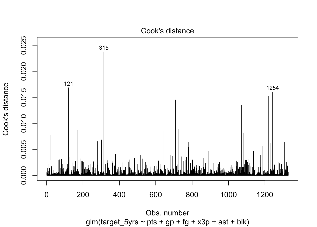 data = df_nba, family = binomial(link = logit))STEP 1: Plot distribution of Cook’s Distance