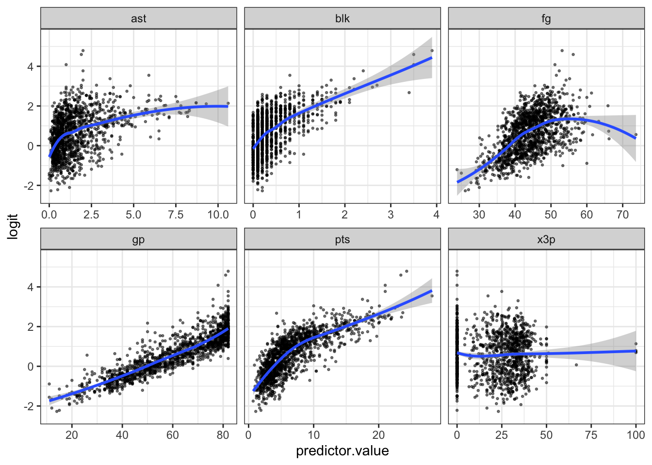 We can check this assumption by predicting the logits (aka the log odds), saving them to our dataset, and then plotting them against each independent variable.