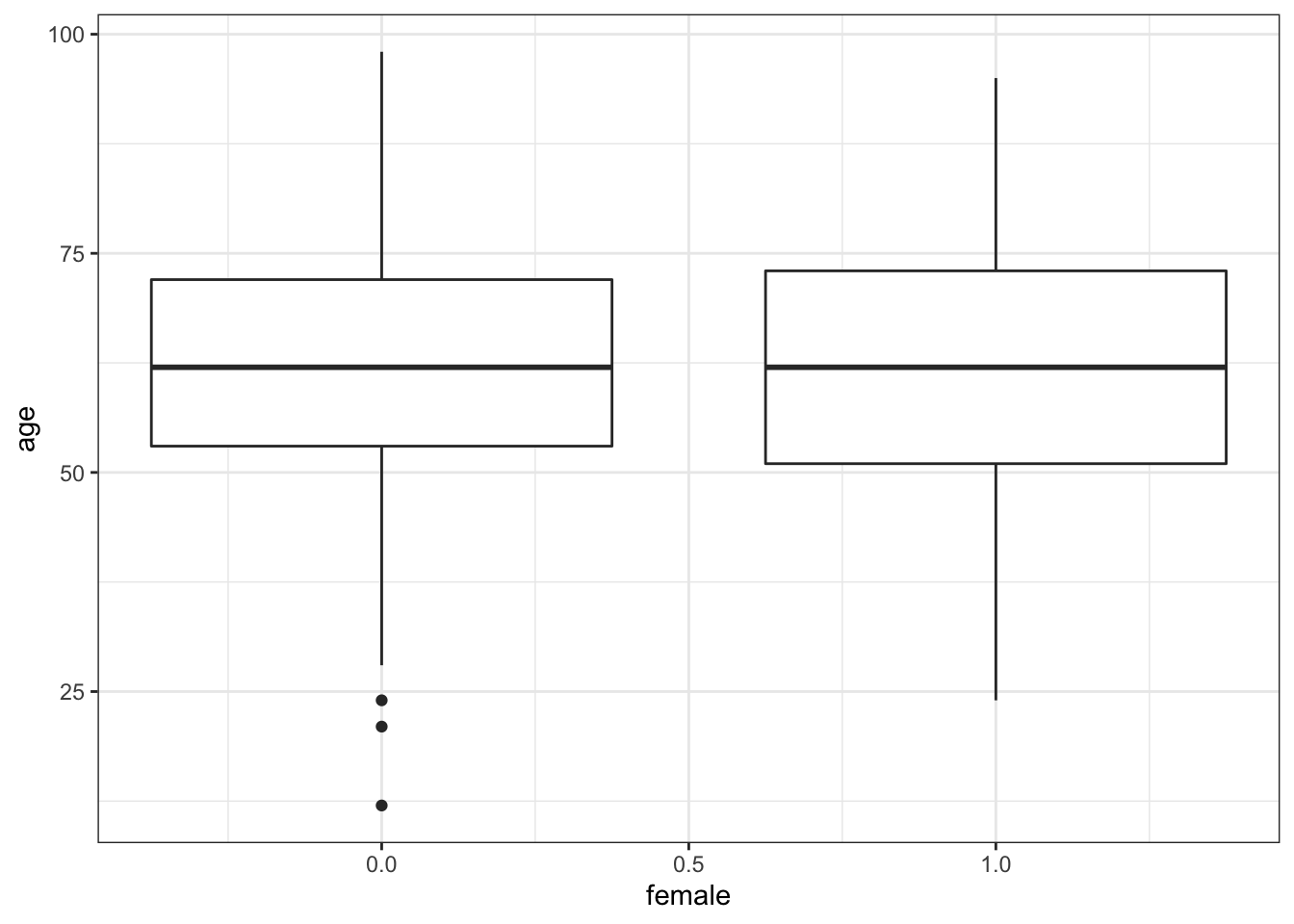 ggplot(data = mydata, aes(y = age, x = female, group = female)) +