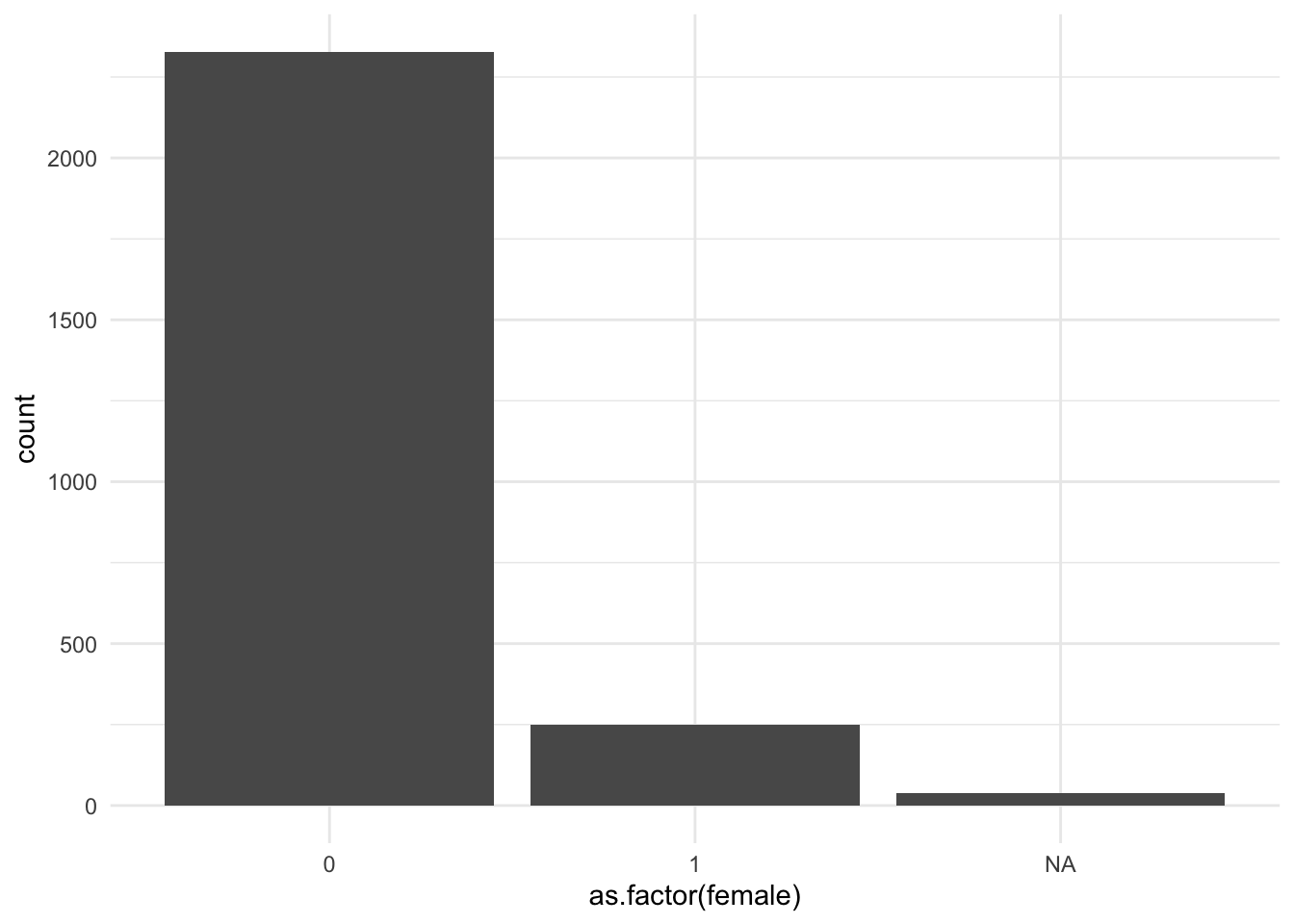 ggplot(data = mydata %>% drop_na(female), aes(x = as.factor(female))) +