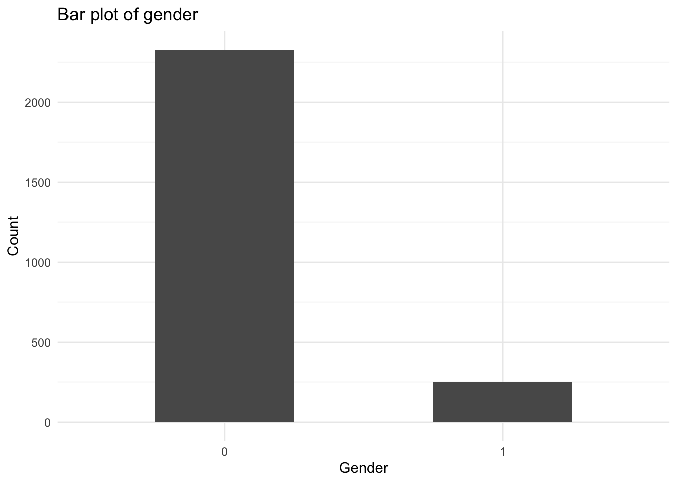 Let’s try making a bar plot of gender. Note I have to turn female into a factor. This doesn’t permanently transform the variable. It just temporarily transforms the variable for this plot.