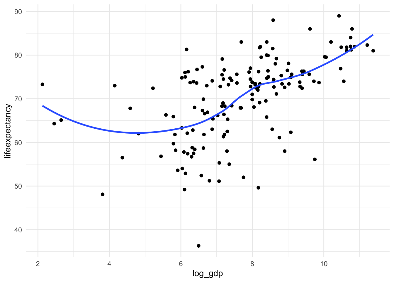 mutate(log_gdp = log(gdp))C) Now let’s look at the scatter plot again