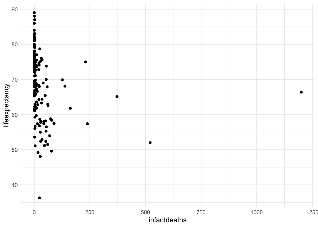 ggplot(mydata, aes(x = infantdeaths, y = lifeexpectancy)) +