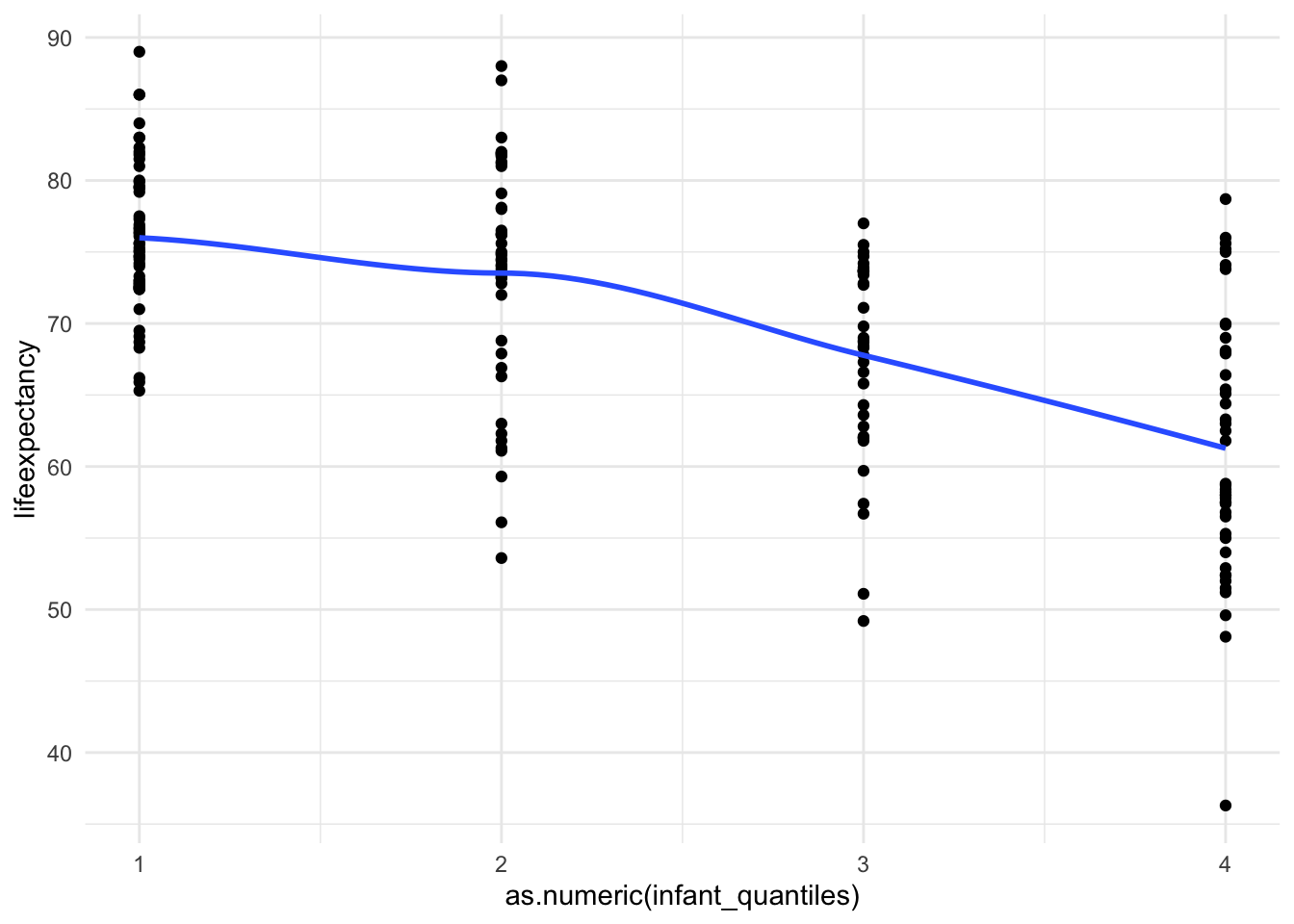 ggplot(mydata, aes(x = as.numeric(infant_quantiles), y = lifeexpectancy)) +