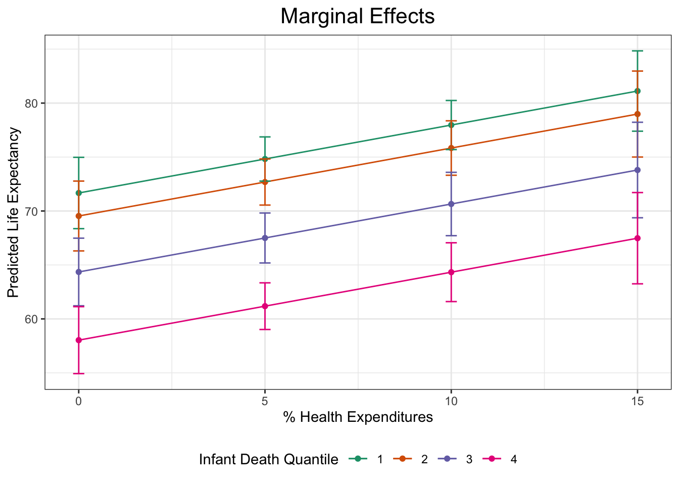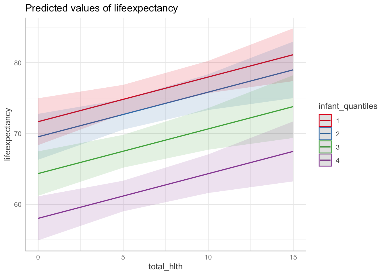 NOTE: This is a good example of why you have to be precise with ggpredict() margins. By changing our specification of infant_quantiles, we can find out the predicted life expectancy for a) only the first quantile at different levels of health expenditure OR b) each quantile at different levels of health expenditure.