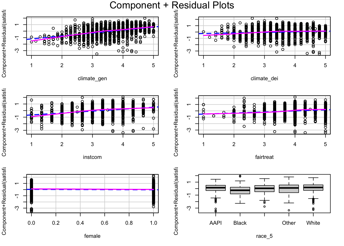 fit6 <- lm(satisfaction ~ climate_gen + instcom + race_5 + female*climate_dei,