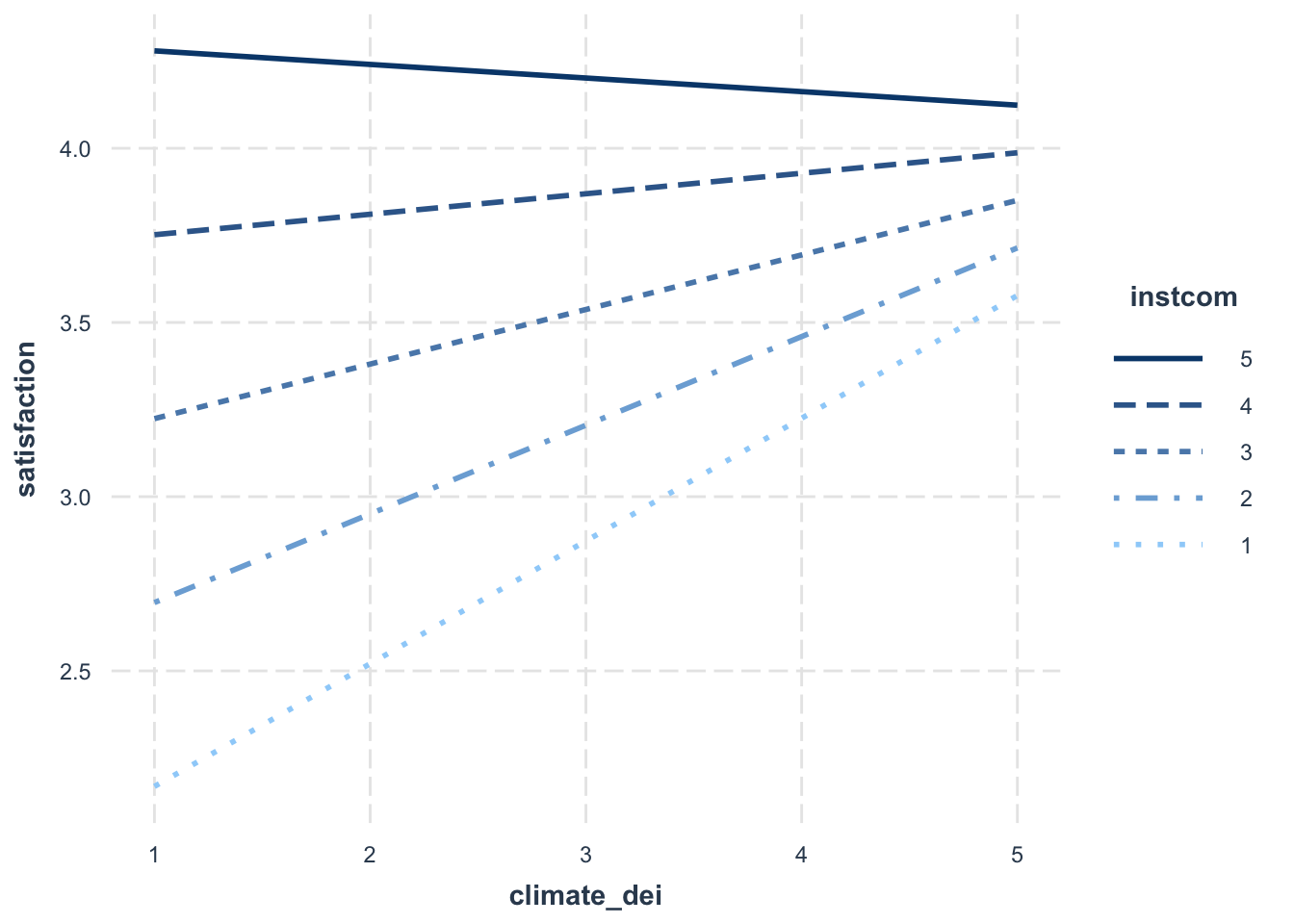- For students with low perception of the institution’s commitment to DEI, increased DEI climate ratings are associated with an significant increase in satisfaction. As perception of the institution’s commitment to DEI increases, the effect of DEI climate on satisfaction dampens (the slope gets less steep).