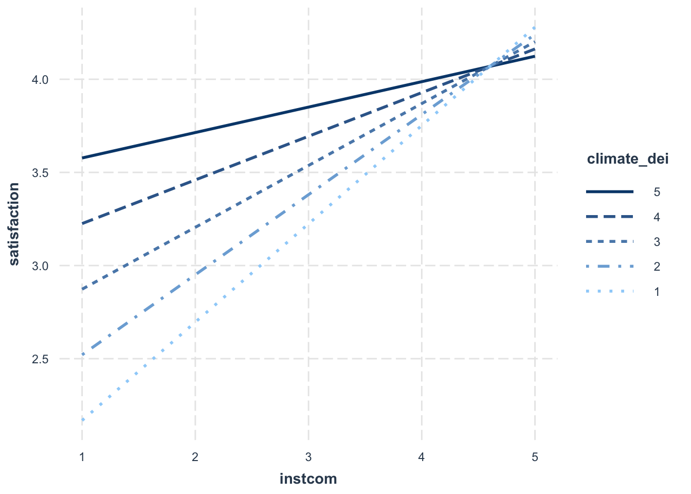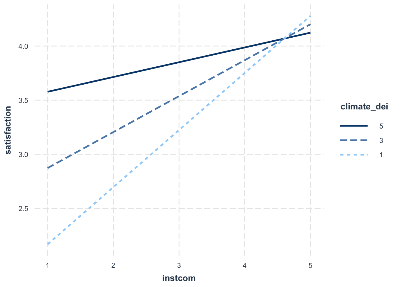 fit1 <- lm(satisfaction ~ climate_gen + climate_dei + instcom +