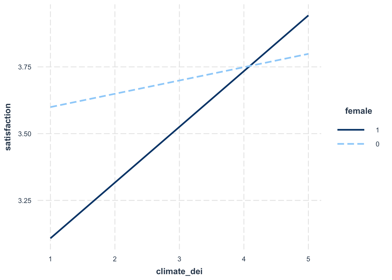 The positive effect/association of rating of DEI climate on/with satisfaction is stronger for females than males.