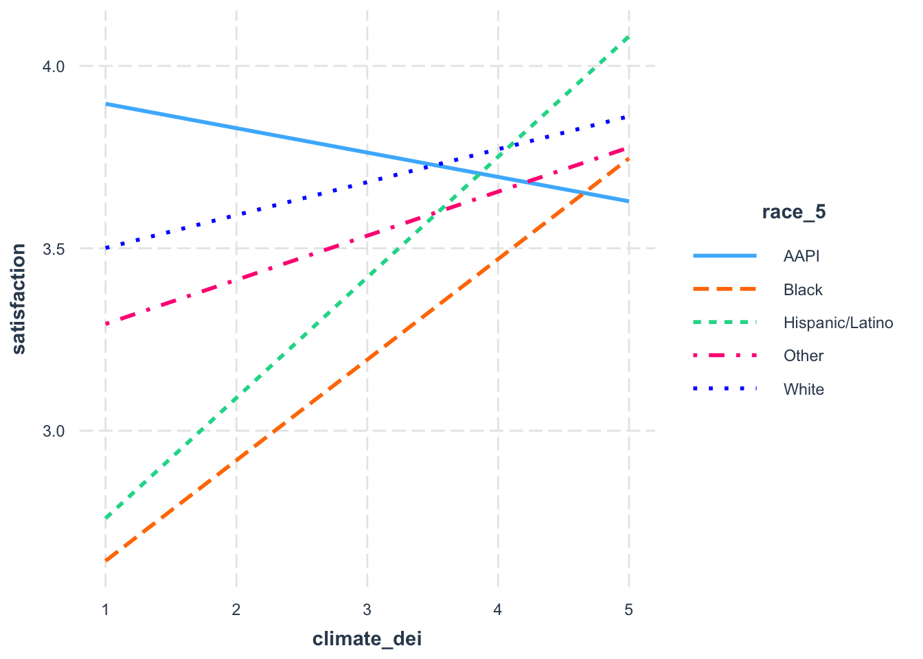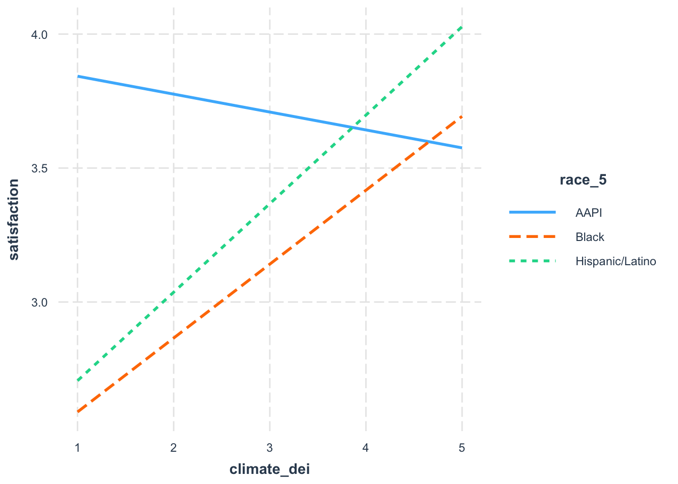 Let’s say, though, that you’re only interested in comparing how DEI and satisfaction differs. You might want to specify which racial groups to plot.