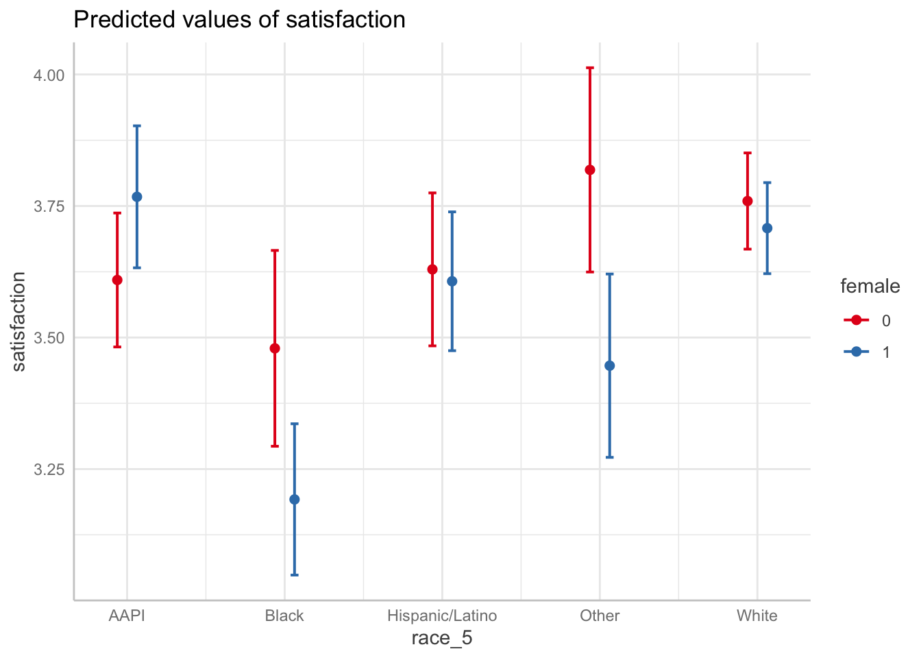 - FOCUS ON TWO DOTS EACH COLUMN TO SEE GENDER DIFFERENCES IN EACH RACIAL GROUP. We can see the difference between female and male satisfaction for each racial group. We can see, for example, that there is a major difference in satisfaction by gender for black students and students whose identity was grouped into other. Interestingly, the confidence intervals tell us that while the ‘other’ category’s difference is statistically significant, we can’t be sure for black students given the overlap.